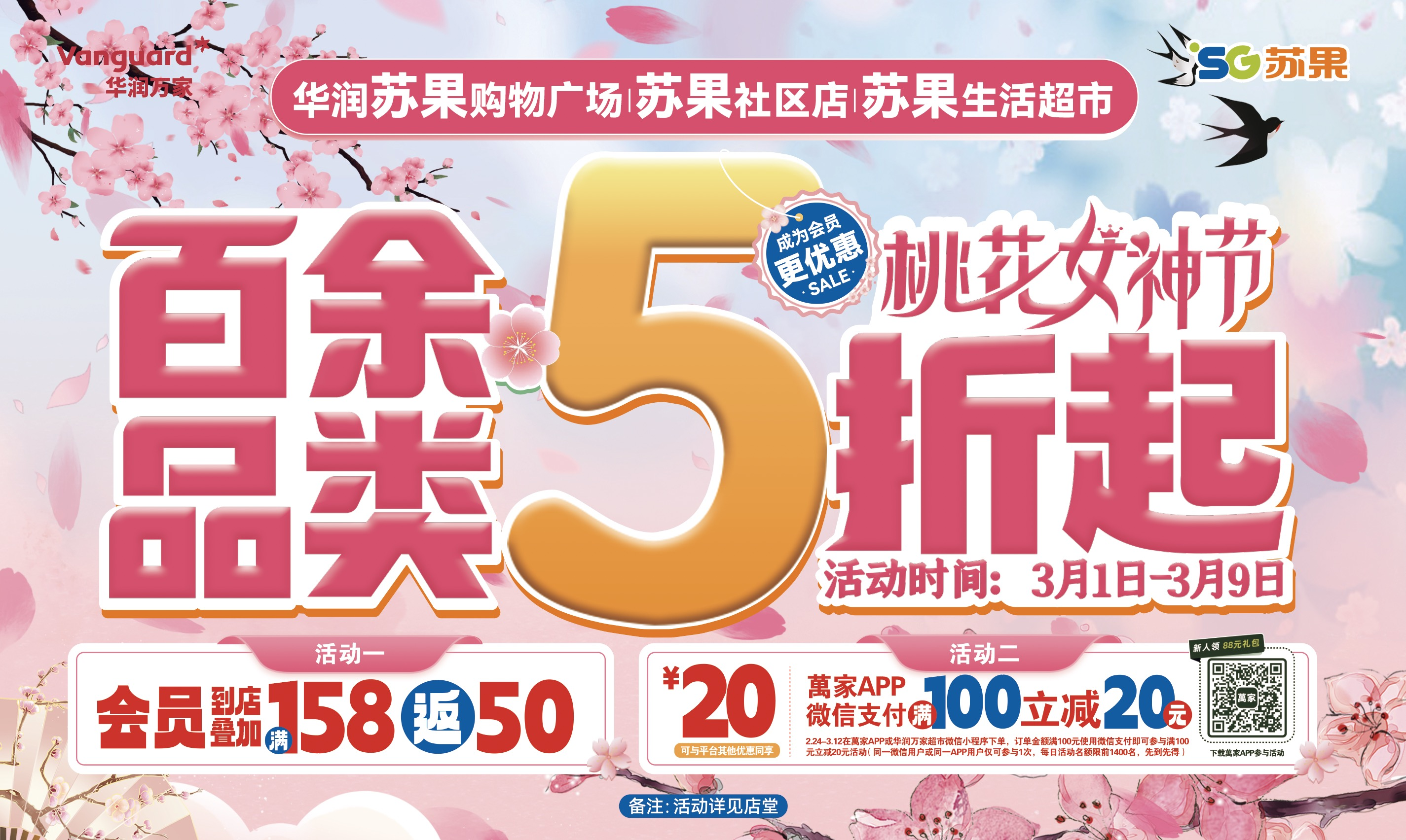 據(jù)了解,華潤(rùn)蘇果針對(duì)女神節(jié)推出5折至8.5折的大力度折扣,涵蓋百貨、日化、食品、日配、生鮮等眾多商品。如成人牙刷、洗衣凝珠、毛巾、服裝等5折;洗護(hù)發(fā)、沐浴露、成人牙膏、洗手液、衛(wèi)生巾、抽紙、床上用品、內(nèi)衣褲等6折;洗衣液、洗衣粉、紙尿褲等6.5折;食醋、料酒、麻油、醬油等6.9折;雜糧、南北干貨、火鍋底料、啤酒、洋酒、護(hù)膚品、一次性餐具、頭發(fā)造型、寵物食品等7折;預(yù)制菜、掛面、鍋具、潔廁用品等7.5折;常溫牛奶、低溫酸奶、孕嬰奶粉、方便面、冷凍水餃、碳酸飲料等8折;雞精、味精、糕團(tuán)等8.5折。