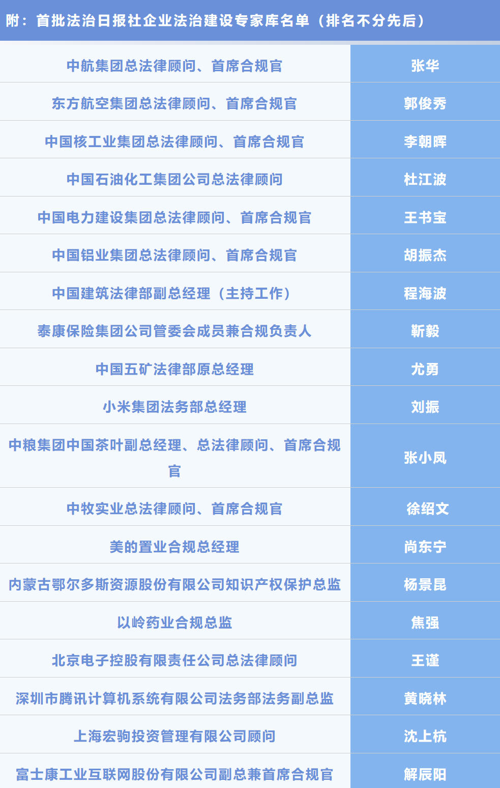 法制日報(bào)社企業(yè)法治建設(shè)專家聘任儀式同日舉行。這是法制日報(bào)社聘任的首批企業(yè)法治建設(shè)專家,共19位資深企業(yè)法務(wù)專家獲聘,均為來自知名企業(yè)的總法律顧問、首席合規(guī)官、法律合規(guī)部門負(fù)責(zé)人或致力于推動企業(yè)法治建設(shè)的專業(yè)人士。