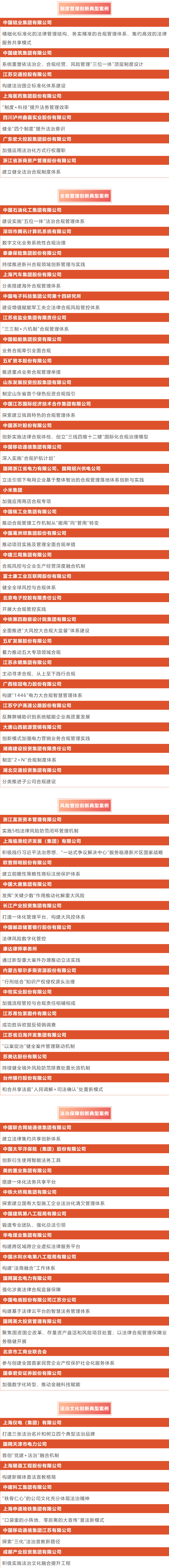 經(jīng)過一個多月的征集、篩選和專家評議,最終從353個案例中產(chǎn)生“制度管理創(chuàng)新典型案例”“合規(guī)管理創(chuàng)新典型案例”“風(fēng)險(xiǎn)管控創(chuàng)新典型案例”“法治保障創(chuàng)新典型案例”“法治文化創(chuàng)新典型案例”5個類別共66個典型案例。結(jié)果如下(排名不分先后):