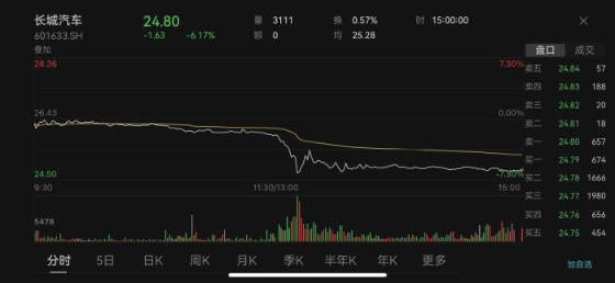 25日盤中,長(zhǎng)城汽車一度跌超7%,比亞迪跌超2%。截至收盤,長(zhǎng)城汽車股價(jià)報(bào)24.80元,下跌6.17%。比亞迪股價(jià)報(bào)255.60元,下跌2.41%。汽車整車板塊則下跌0.85%。有股民留言,“最慘的是同時(shí)擁有重倉(cāng)長(zhǎng)城汽車和比亞迪的股民,例如我,太慘了?!?/p>