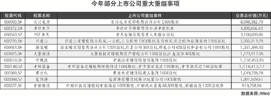 從并購重組參與方來看,今年國企上市公司的并購重組表現(xiàn)尤其活躍,且交易價值不菲。今年披露的12個交易總價值過百億元的重大重組事件中,有11個事件參與方為國企上市公司。其中,長江電力定增收購云川公司100%股權(quán)事件,交易總價值達(dá)804.84億元,位居首位。