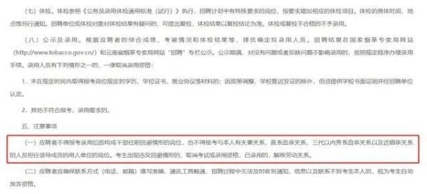 該公告第二條第八款規(guī)定,符合煙草行業(yè)招聘工作回避制度規(guī)定,應(yīng)聘人員不得應(yīng)聘錄用后即構(gòu)成干部任職回避情形的崗位,也不得應(yīng)聘與本人有夫妻關(guān)系、直系血親關(guān)系、三代以內(nèi)旁系血親關(guān)系以及近姻親關(guān)系的人員擔(dān)任領(lǐng)導(dǎo)成員的單位系統(tǒng)的崗位。