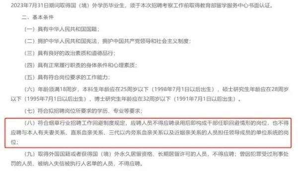 比如青海省煙草專賣局(公司)于7月13日發(fā)布的2023年高校畢業(yè)生招聘公告,同樣明確提出:應(yīng)聘人員不得報(bào)考與本人有夫妻關(guān)系、直系血親關(guān)系、三代以內(nèi)旁系血親關(guān)系以及近姻親關(guān)系的人員所屬市州局(公司)相關(guān)崗位。應(yīng)聘人員的直系親屬、三代以內(nèi)旁系血親以及近姻親有在青海煙草系統(tǒng)工作的,報(bào)名時(shí)須如實(shí)說明。故意隱瞞不報(bào)的,一經(jīng)查實(shí),直接取消考試或錄用資格;已經(jīng)錄用的,依法解除勞動(dòng)關(guān)系。