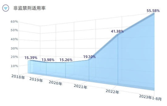 從非監(jiān)禁刑的適用情況看,輕罪案件被宣告緩刑、判處管制、單處罰金等非監(jiān)禁刑的比例呈現(xiàn)上升趨勢,近兩年來尤為明顯。2018年非監(jiān)禁刑適用率僅為15.39%,2022年該比例則上升至41.38%,較2018年上升26個百分點。今年1-8月份,非監(jiān)禁刑的適用率則上升至55.58%。