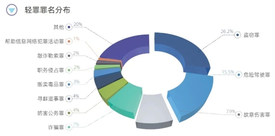 從輕罪案件所涉罪名類型看,海淀區(qū)檢察院受理的輕罪案件涵蓋刑法分則各個章節(jié),涉及150個罪名,以傳統(tǒng)自然犯和新型法定犯、經(jīng)濟(jì)犯罪居多。其中,盜竊罪、危險駕駛罪、故意傷害罪是輕罪案件中人數(shù)排名前三的罪名。具體來說,盜竊罪排名第一位,占比26.2%;自醉駕入刑以來,危險駕駛罪持續(xù)高發(fā),排名第二位,占比15.5%;隨著生活節(jié)奏加快、社會關(guān)系更加復(fù)雜,人們由于各種生活摩擦產(chǎn)生的矛盾和糾紛導(dǎo)致的故意傷害類犯罪頻繁發(fā)生,在輕罪案件中排名第三,占比7.9%;另外,自2021年以來,隨著信息化時代到來以及電信網(wǎng)絡(luò)詐騙犯罪高發(fā),與之相關(guān)的幫助信息網(wǎng)絡(luò)犯罪活動罪人數(shù)排名進(jìn)入輕罪案件前十位。