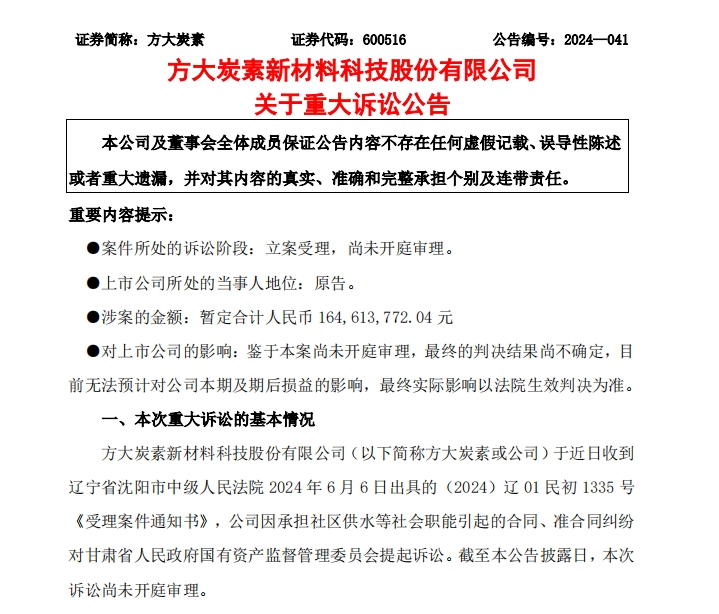 6月11日晚間,方大炭素新材料科技股份有限公司(下稱“方大炭素”)發(fā)布公告稱,公司近日收到遼寧省沈陽市中級人民法院 2024年6月6日出具的(2024)遼01民初1335號《受理案件通知書》,公司因承擔(dān)社區(qū)供水等社會職能引起的合同、準(zhǔn)合同糾紛對甘肅省人民政府國有資產(chǎn)監(jiān)督管理委員會提起訴訟。截至本公告披露日,本次訴訟尚未開庭審理。