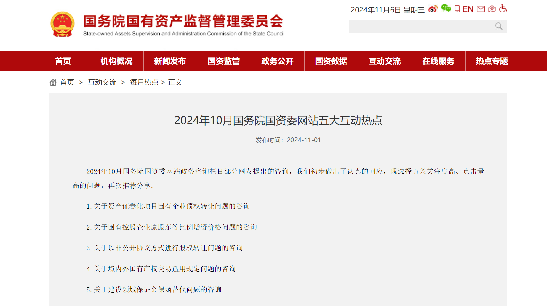 近日,國務院國資委對2024年10月官網(wǎng)政務咨詢欄目部分網(wǎng)友提出的咨詢,初步作出了回應,并選取了5條關注度高、點擊量高的問題,再次推薦分享。