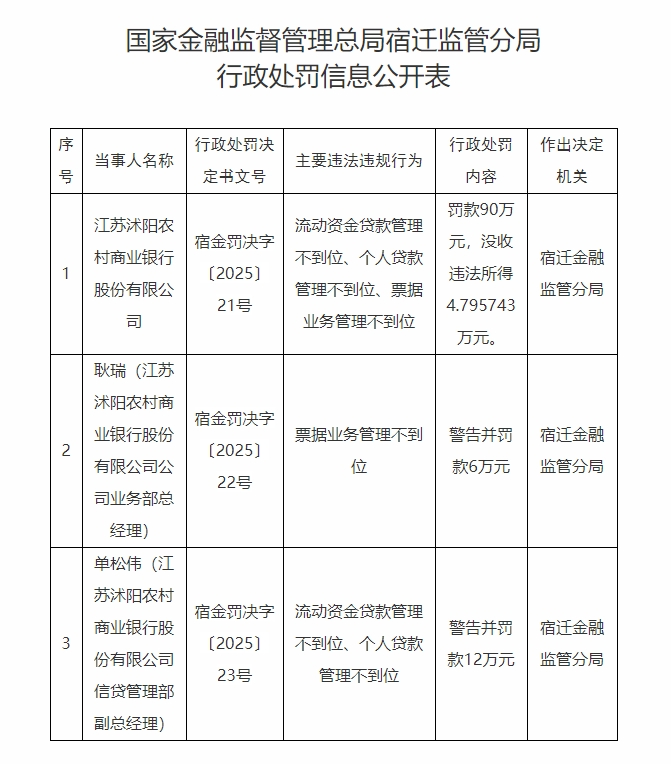根據(jù)行政處罰信息,沭陽農(nóng)商銀行主要存在3項違法違規(guī)行為:流動資金貸款管理不到位、個人貸款管理不到位、票據(jù)業(yè)務(wù)管理不到位。因此,宿遷金融監(jiān)管分局對其作出罰款90萬元、沒收違法所得4.795743萬元的行政處罰。