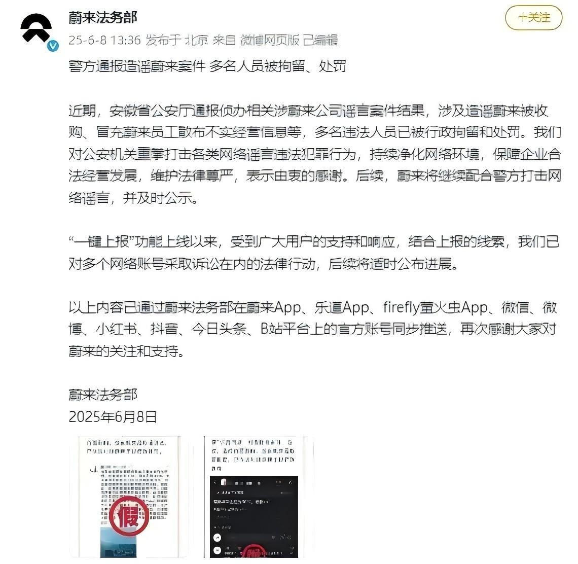 以上內(nèi)容已通過(guò)蔚來(lái)法務(wù)部在蔚來(lái)App、樂(lè)道App、firefly螢火蟲(chóng)App、微信、微博、小紅書(shū)、抖音、今日頭條、B站平臺(tái)上的官方賬號(hào)同步推送,再次感謝大家對(duì)蔚來(lái)的關(guān)注和支持。