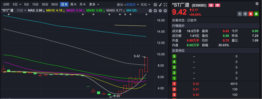 北交所公司*ST廣道(839680)股價仍在“狂飆”。