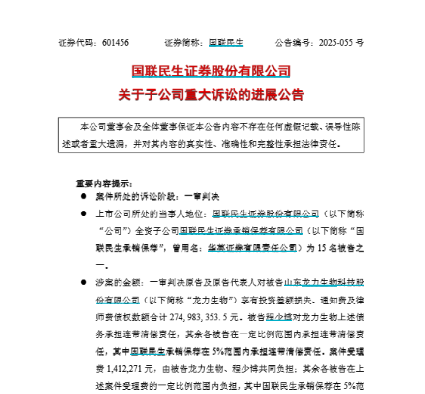中介機(jī)構(gòu)方面,國(guó)聯(lián)民生證券承銷保薦有限公司(簡(jiǎn)稱“國(guó)聯(lián)民生承銷保薦”)在原告各項(xiàng)損失5%的范圍內(nèi)承擔(dān)連帶賠償責(zé)任,立信會(huì)計(jì)師事務(wù)所(以下簡(jiǎn)稱“立信所”)在原告各項(xiàng)損失30%的范圍內(nèi)承擔(dān)連帶賠償責(zé)任。8月26日晚間,國(guó)聯(lián)民生發(fā)布關(guān)于子公司重大訴訟的進(jìn)展公告,公告了該事項(xiàng)。
