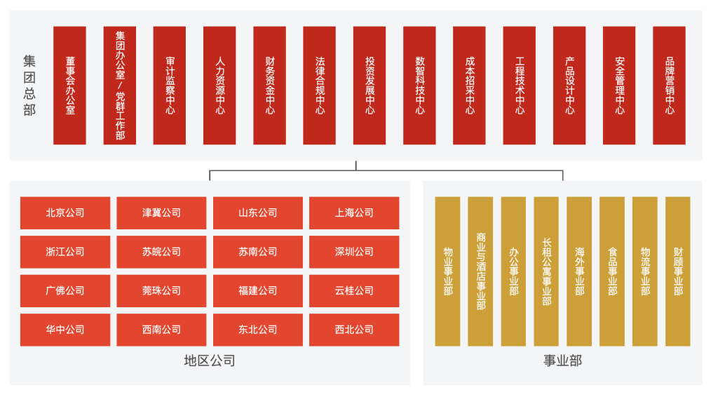 根據(jù)最新的組織架構(gòu),萬科集團(tuán)總部除了董事會辦公室、集團(tuán)辦公室/黨群工作部外,還設(shè)有投資發(fā)展中心、成本招采中心、工程技術(shù)中心、產(chǎn)品設(shè)計(jì)中心等11個中心;地區(qū)公司分為北京公司、津冀公司、山東公司、上海公司等16個公司;原物業(yè)事業(yè)集團(tuán)(BG)等統(tǒng)一歸為事業(yè)部,目前包含物業(yè)、商業(yè)與酒店、辦公、長租公寓、物流等八大多元化業(yè)務(wù)。