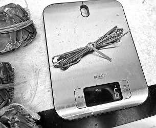 記者對螃蟹捆扎繩稱重。 施本允/攝