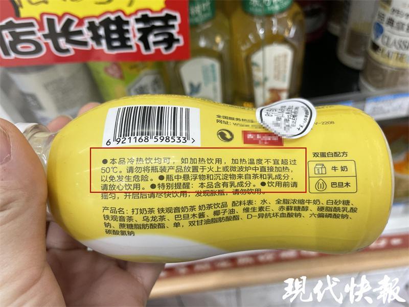 按照這名工作人員的指示,記者查看了暖柜中飲料的瓶身標識。在加熱飲料的瓶身上,都用文字標注了 " 本品冷熱飲均可,如加熱飲用,加熱溫度不宜超過 50 ℃。"" 冷熱飲均可,熱飲時請注意,避免燙傷。"