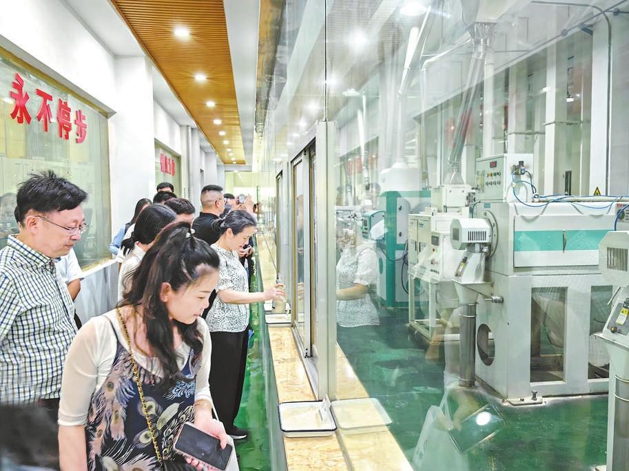 圖為7月7日,消費(fèi)者在米業(yè)公司生產(chǎn)車間了解大米的生產(chǎn)工藝流程。