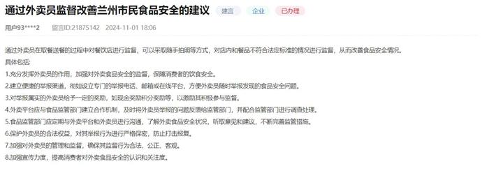 該網(wǎng)友建議建立便捷的舉報渠道,如設立專門的舉報電話、郵箱或在線平臺,方便外賣員隨時舉報發(fā)現(xiàn)的食品安全問題;對舉報屬實的外賣員給予一定的獎勵,如現(xiàn)金獎勵、積分獎勵等,以激勵其積極參與監(jiān)督;食品監(jiān)管部門應定期與外賣平臺和外賣員進行溝通,了解外賣食品安全狀況,聽取意見和建議,不斷完善監(jiān)管措施;保護外賣員的合法權益,對其舉報行為進行嚴格保密,防止打擊報復;加強對外賣員的管理和監(jiān)督,確保其監(jiān)督行為合法、公正、客觀;加強宣傳力度,提高消費者對外賣食品安全的認識和關注度。