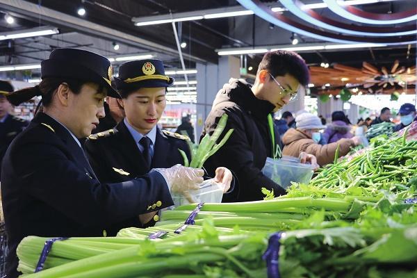 圖為工作人員在農(nóng)貿(mào)市場(chǎng)內(nèi)快檢。王丹本報(bào)記者 謝旺 文/攝