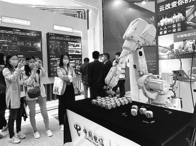 5月17日,2021年世界電信和信息社會(huì)日大會(huì)上,人們正在圍觀一款5G工業(yè)機(jī)器人。本報(bào)記者 劉坤攝/光明圖片