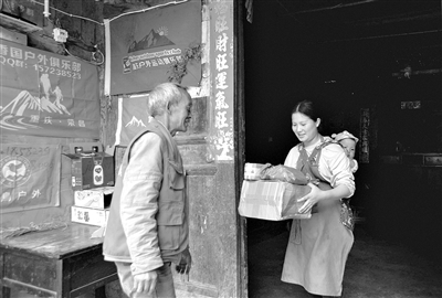 2020年下半年,漢源郵政在古路村設(shè)立了村郵站,村民通過電商平臺購物變得更加方便,村里的花椒、核桃、臘肉等土特產(chǎn)品也拓寬了銷售渠道。圖為郵政代辦員向開強(qiáng)(左)把包裹送到村民李娟家中?! ∮浾?江宏景 攝