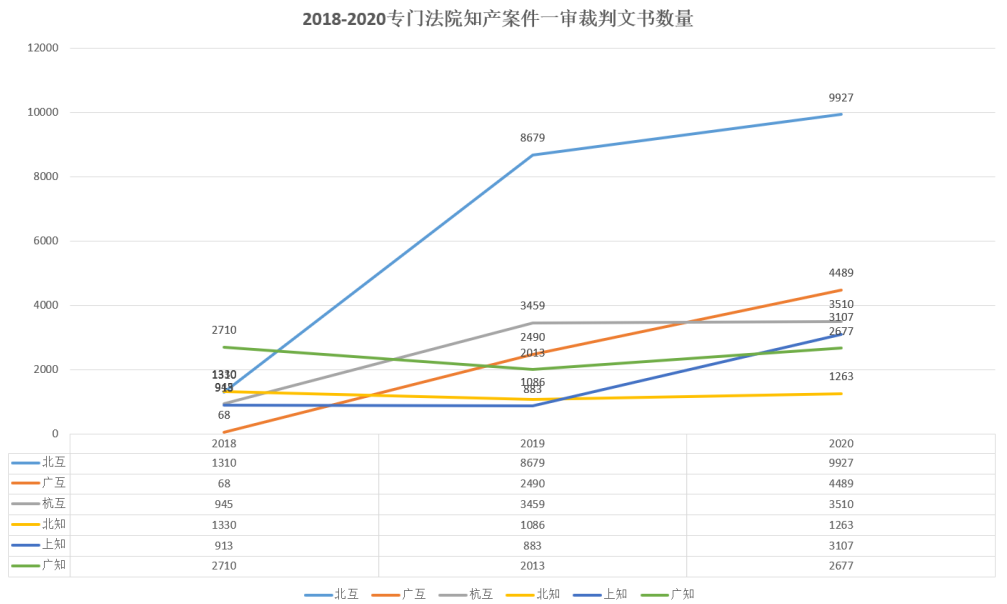 從整體趨勢上看,6個專門法院中除廣知外均呈現上升趨勢;三大互聯法院裁判文書的總數量整體高于三大知識產權法院。其中,北互、廣互從2018-2020年數據呈現一個快速攀升的趨勢,北互的裁判文書數量從1310上升到9927,廣互的裁判文書數量從68上升到4489。