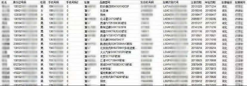 賣家向記者展示了之前交易的聊天記錄和車險信息數(shù)據(jù)樣本,并保證“信息都是真實的”。在他展示的數(shù)據(jù)樣本中,包含車主姓名、身份證號、手機號、車牌、車型、發(fā)動機號、車架號、車檢日期等詳細信息。