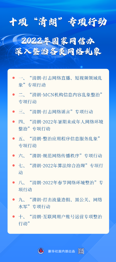 新華社北京3月17日電(記者王思北)記者17日從國新辦舉行的新聞發(fā)布會(huì)獲悉,2022年“清朗”系列專項(xiàng)行動(dòng)將重點(diǎn)開展打擊網(wǎng)絡(luò)謠言,打擊網(wǎng)絡(luò)直播、短視頻領(lǐng)域亂象,算法綜合治理,暑期未成年人網(wǎng)絡(luò)環(huán)境整治等十方面任務(wù)。
