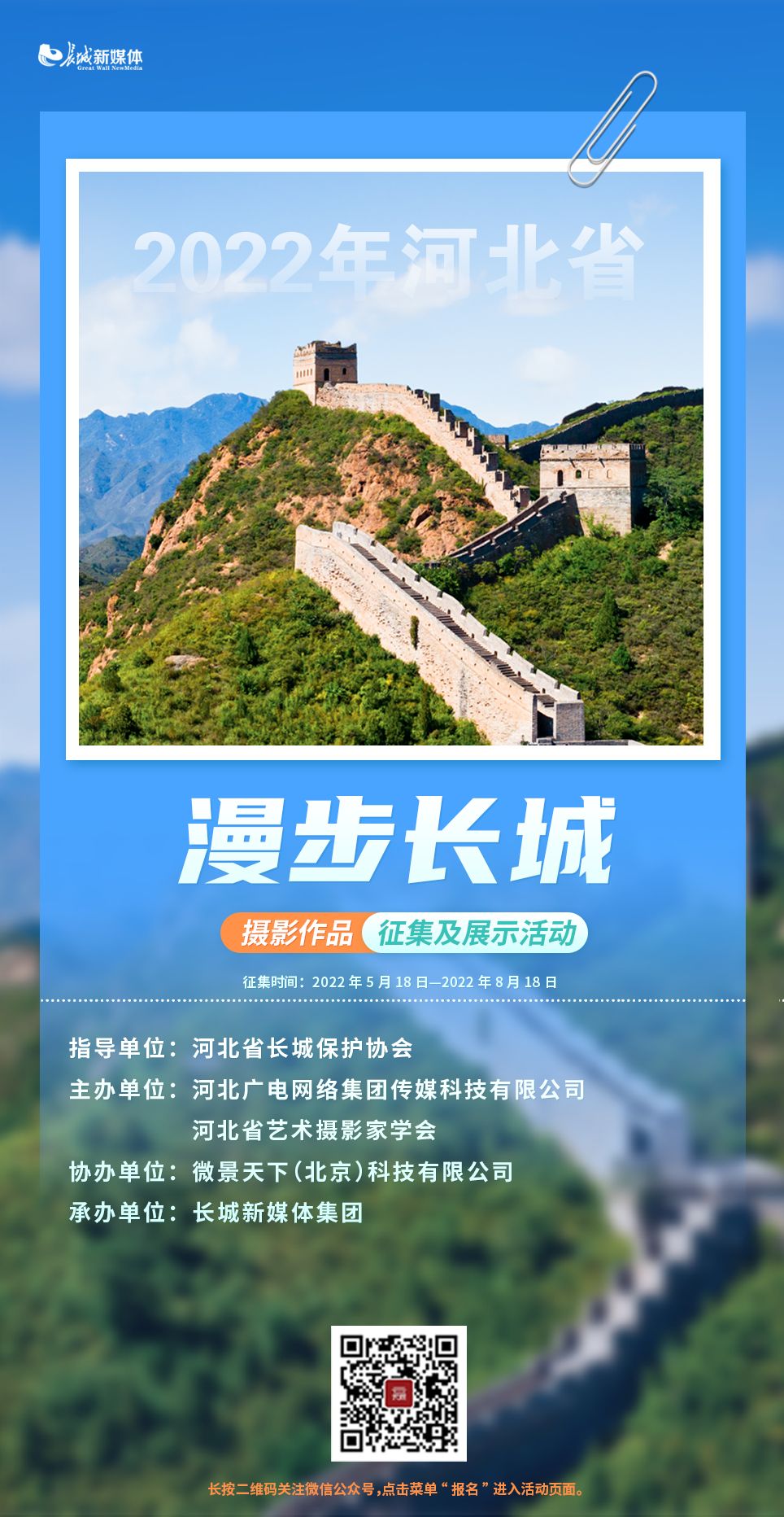 據(jù)悉,本次攝影大賽由河北省長城保護(hù)協(xié)會為指導(dǎo)單位,河北廣電網(wǎng)絡(luò)集團(tuán)傳媒科技有限公司、河北省藝術(shù)攝影家學(xué)會聯(lián)合主辦,微景天下(北京)科技有限公司協(xié)辦,長城新媒體集團(tuán)承辦。