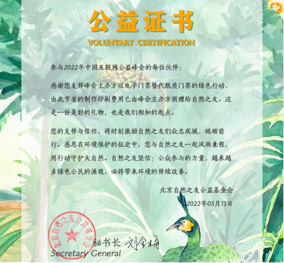 圖說:捐出門票成本后,峰會組委會收到了北京自然之友基金會寫來的感謝信