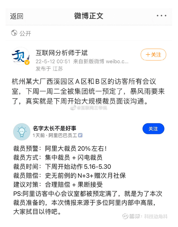 隨后,認(rèn)證為阿里巴巴員工的一名脈脈用戶發(fā)布“裁員預(yù)警”,其稱阿里將大裁員20%左右,裁員賠償是史無前例的N+3并贈(zèng)次月社保。該員工也透露,“阿里訪客中心的會(huì)議室都被預(yù)定滿了,就是為了本次裁員準(zhǔn)備的,本次情報(bào)來源于多位阿里內(nèi)部中高層。”