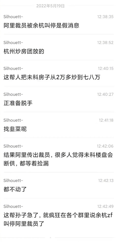 這般異常也引發(fā)了外界諸多猜測(cè)。5月18日,一則微信聊天記錄截圖在微博流傳,據(jù)截圖顯示,有網(wǎng)友稱“阿里這周因?yàn)椴脝T,影響太大,面比較廣,被余杭叫停了,要求先申請(qǐng),裁員報(bào)備?!?月19日,另一網(wǎng)友出來“辟謠”,其稱“阿里裁員被余杭叫停是假消息,杭州炒房團(tuán)放的。”