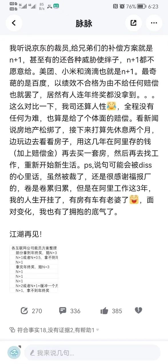 對(duì)于被裁,阿里人似乎并沒有外界想象中的“憤怒”。法治網(wǎng)研究院發(fā)現(xiàn),一名阿里員工在脈脈上頗為平靜地講述了被裁后的心路歷程。該員工稱自己剛談完賠償,人力給的補(bǔ)償方案是:N(經(jīng)濟(jì)補(bǔ)償金)+1(代通知金)+2(提前解約補(bǔ)助)。整體算下來,工作三年的他可以拿到30萬左右的賠償?!斑€是很感謝福報(bào)廠的,卷是卷累歸累,但是在阿里工作這三年,我的人生開掛了,有房有車有老婆了,面對(duì)變化,我也有了擁抱的底氣了?!?/p>