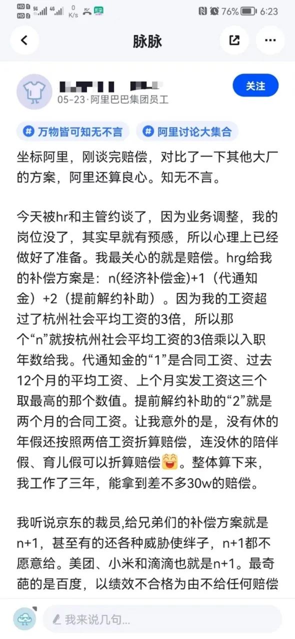 有阿里員工發(fā)文稱,“今天被約談了,這周五走N+3,緩沖29天是N+1,去年的校招生,目前手里沒offer,正在面試”。該員工還糾結(jié)是再待一個月還是拿n+3走人。還有員工發(fā)文證實阿里裁員N+3,并稱和之前流傳消息不同的是,最后期限提前到周三以及沒有次月社保。