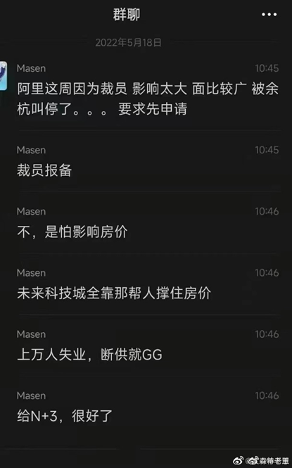 這般異常也引發(fā)了外界諸多猜測。5月18日,一則微信聊天記錄截圖在微博流傳,據(jù)截圖顯示,有網(wǎng)友稱“阿里這周因為裁員,影響太大,面比較廣,被余杭叫停了,要求先申請,裁員報備?!?月19日,另一網(wǎng)友出來“辟謠”,其稱“阿里裁員被余杭叫停是假消息,杭州炒房團(tuán)放的?!?/p>