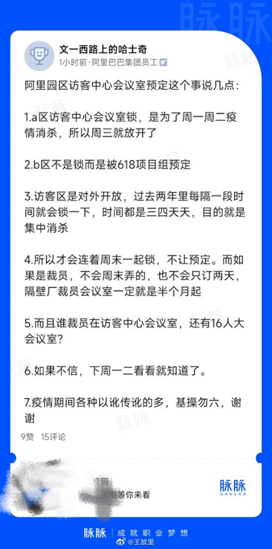 針對上述爆料,另一阿里員工當(dāng)天在脈脈發(fā)布長文回應(yīng)稱,A區(qū)訪客中心會議室被鎖是為了疫情消殺,B區(qū)是被618項目組預(yù)定,訪客區(qū)是對外開放的,過去兩年里每隔一段時間就會因集中消殺而封鎖,時間都是三四天。