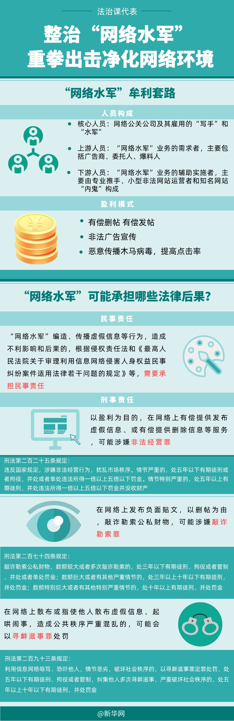 6月27日,公安部網(wǎng)安局在全國范圍內(nèi)啟動為期6個(gè)月的依法打擊整治“網(wǎng)絡(luò)水軍”專項(xiàng)工作?!熬W(wǎng)絡(luò)水軍”的牟利套路有哪些?可能承擔(dān)哪些法律后果?一圖帶你了解一下!