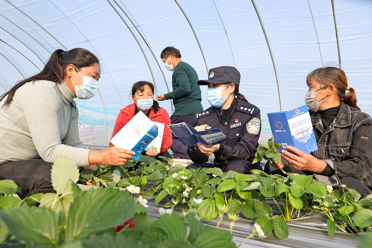 圖為黨員民警向村民宣傳反詐知識,同時聽取他們對公安工作的意見建議。