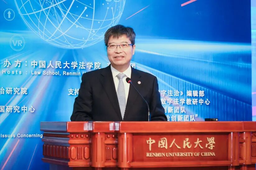 圖為中國(guó)人民大學(xué)校長(zhǎng)林尚立在平行主題論壇——第六屆“未來法治與數(shù)字法學(xué)”國(guó)際論壇中致辭。