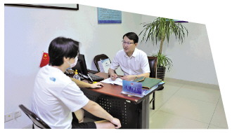 邢輝(右)在常州公共法律服務(wù)中心接待群眾法律咨詢。