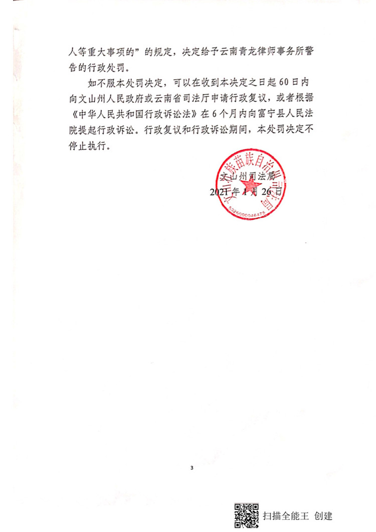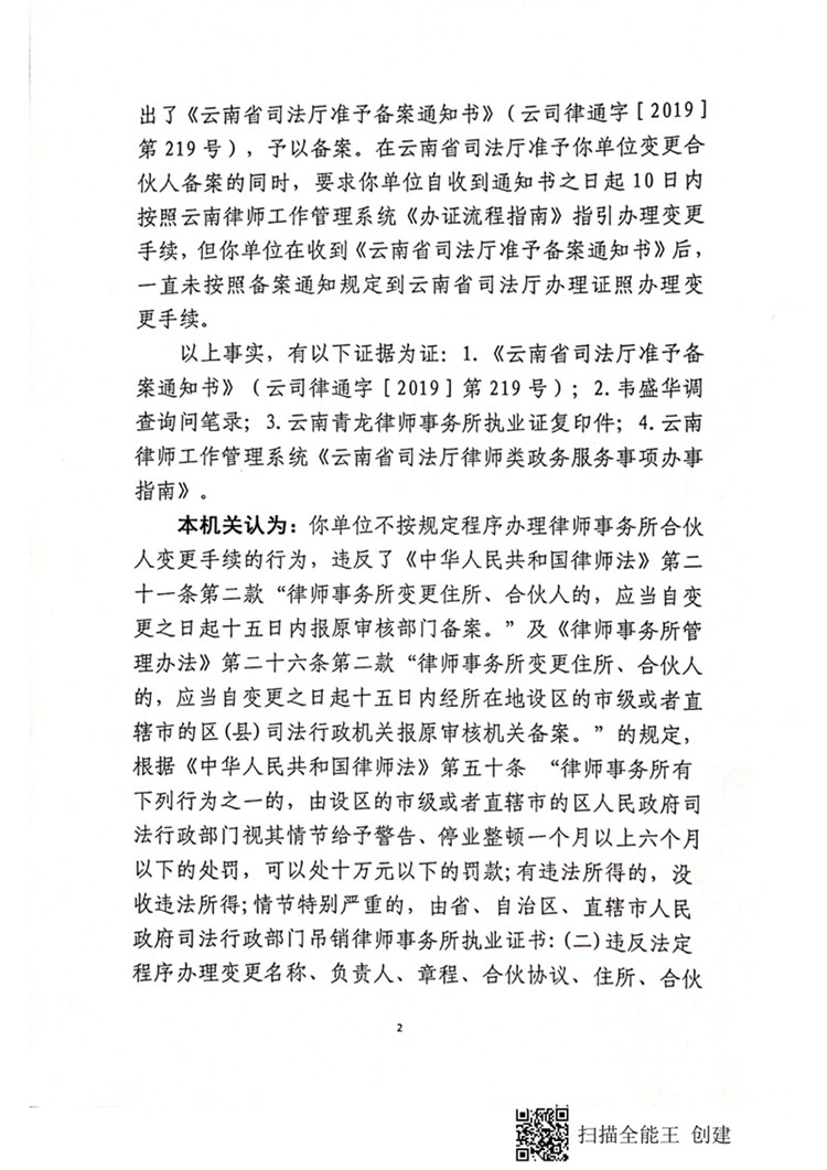 云南青龍律師事務(wù)所因不按照規(guī)定辦理律師事務(wù)所合伙人變更被處警告
