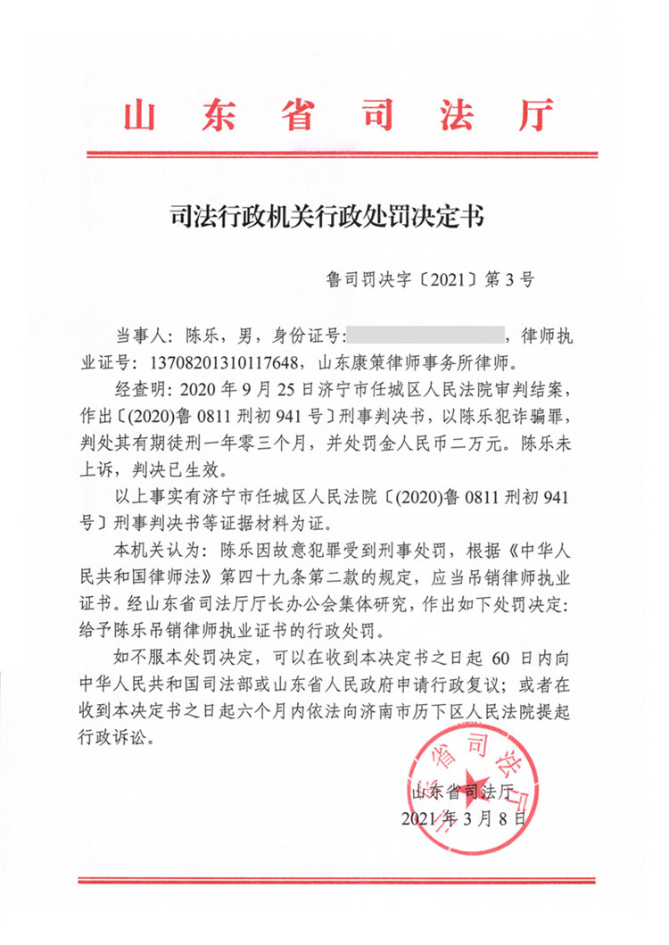 山東律師陳樂因故意犯罪被處吊銷律師執(zhí)業(yè)證書