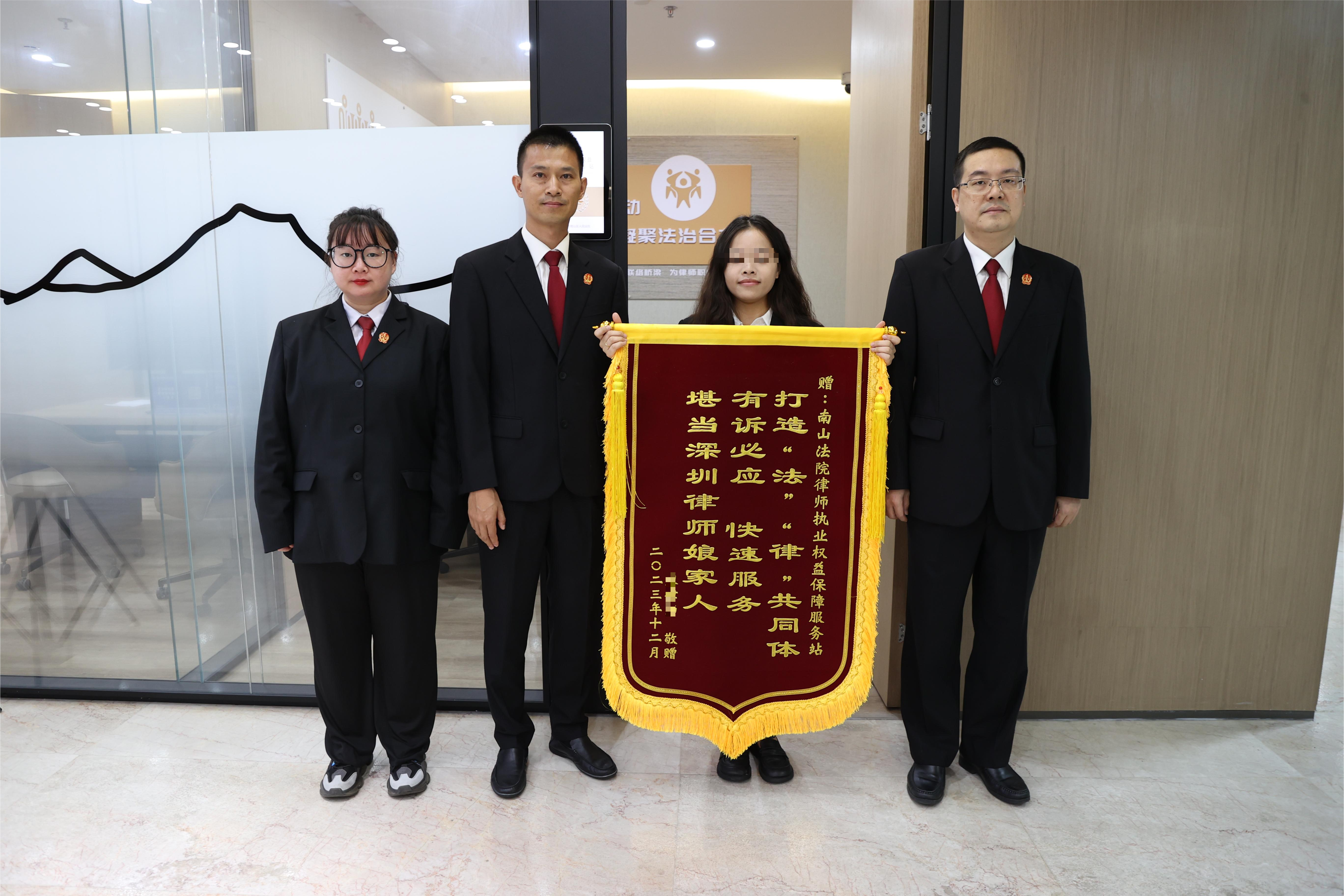 近日,廣東省深圳市南山區(qū)人民法院收到一名律師專程送來的錦旗:“南山法院律師執(zhí)業(yè)權(quán)益保障服務站,打造‘法’‘律’共同體,有訴必應,快速服務,堪當深圳律師娘家人!”