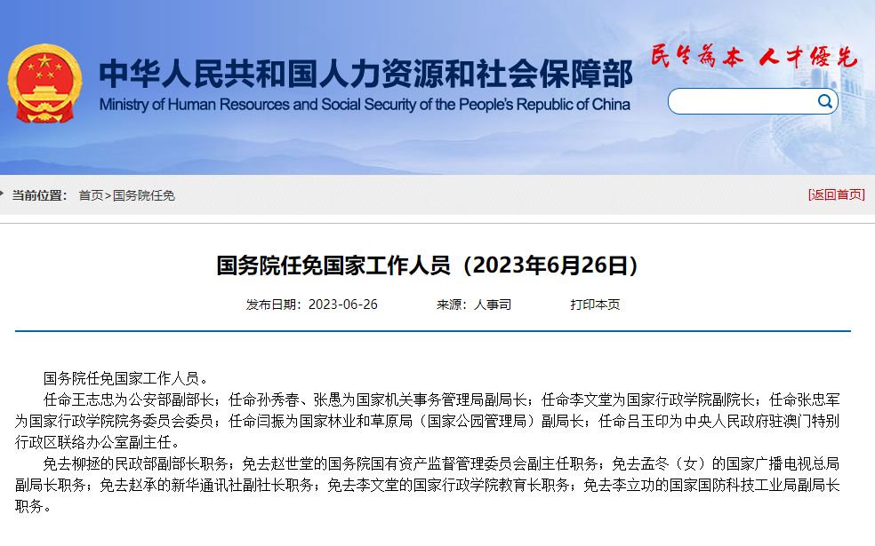 任命王志忠為公安部副部長;任命孫秀春、張愚為國家機關事務管理局副局長;任命李文堂為國家行政學院副院長;任命張忠軍為國家行政學院院務委員會委員;任命閆振為國家林業(yè)和草原局(國家公園管理局)副局長;任命呂玉印為中央人民政府駐澳門特別行政區(qū)聯絡辦公室副主任。