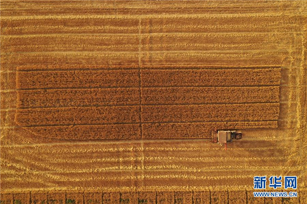 6月13日,雄安新區(qū)大王鎮(zhèn)小王村村民在收獲小麥(無(wú)人機(jī)拍攝)。 近日,雄安新區(qū)小麥陸續(xù)成熟,當(dāng)?shù)卮迕駬屪マr(nóng)時(shí)進(jìn)行收獲。 新華社記者 邢廣利 攝