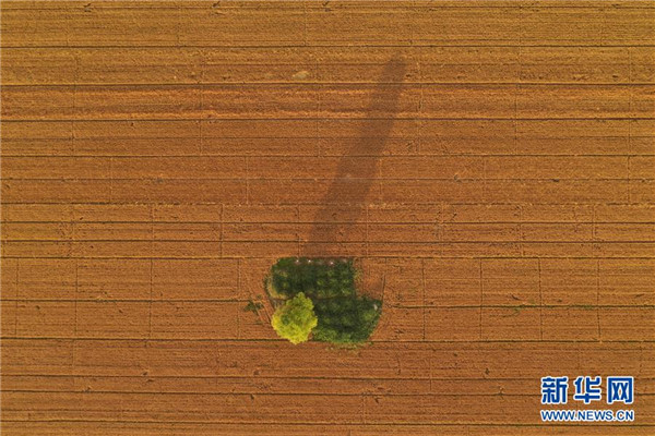 6月13日無人機拍攝的雄安新區(qū)大王鎮(zhèn)小王村成熟的麥田。 近日,雄安新區(qū)小麥陸續(xù)成熟,當?shù)卮迕駬屪マr(nóng)時進行收獲。 新華社記者 朱旭東 攝