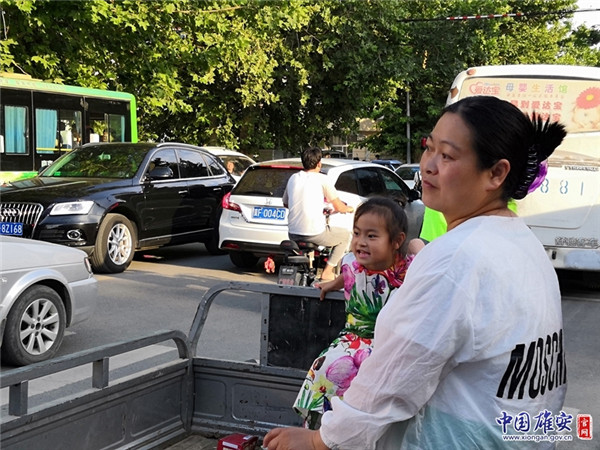 一位小女孩與母親一起在校門外等候考完試的哥哥。中國雄安官網(wǎng)記者朱偉琳 攝