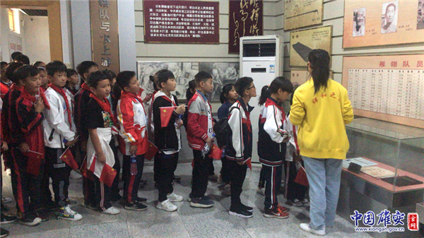 孩子們?cè)诎籽蟮硌泗彡?duì)紀(jì)念館門(mén)口合影留念。中國(guó)雄安官網(wǎng)發(fā)