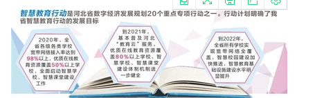 智慧教育行動是河北省數(shù)字經(jīng)濟發(fā)展規(guī)劃20個重點專項行動之一。行動計劃明確了我省智慧教育行動的發(fā)展目標:2020年,全省各級各類學校寬帶網(wǎng)絡接入率達到98%以上,優(yōu)質(zhì)在線教育資源覆蓋50%以上學校,全面啟動智慧學校、智慧課堂建設(shè)工作。到2021年,基本普及河北“教育云”服務,優(yōu)質(zhì)在線教育資源覆蓋80%以上學校,智慧學校、智慧課堂建設(shè)體制機制進一步健全。到2022年,全省所有學校實現(xiàn)寬帶網(wǎng)絡全覆蓋,智慧校園建設(shè)加快推進,智慧教育基礎(chǔ)設(shè)施建設(shè)水平明顯提升。河北“教育云”服務全面普及,優(yōu)質(zhì)教育教學資源的集成推送更加高效,教育管理信息的整合應用更加普及。師生信息化應用水平與信息素養(yǎng)普遍提升,以自主、個性、協(xié)作、泛在為特征的新型教學模式廣泛應用?,F(xiàn)代信息技術(shù)與教育實現(xiàn)深度融合,網(wǎng)絡化、數(shù)字化、智能化、個性化、終身化的教育體系初步形成,智慧教育總體水平躋身中西部前列,教育現(xiàn)代化和教育強省建設(shè)取得重要進展。