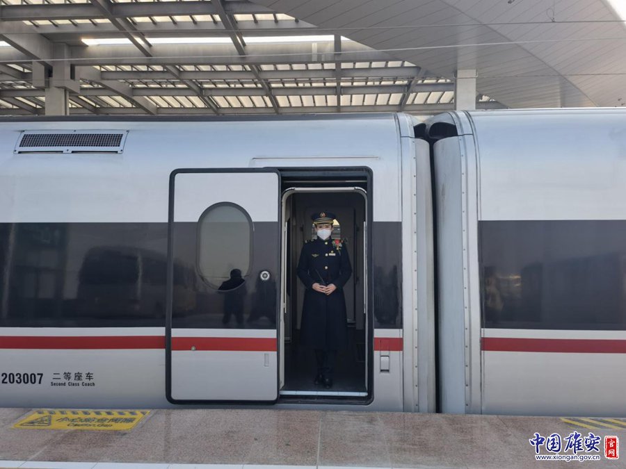 12月27日,乘務(wù)員在雄安開往北京西的C2702次列車旁迎接旅客上車。劉東堯 攝