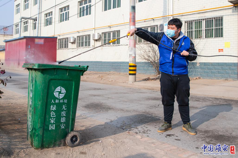三臺鎮(zhèn)崔公堤村黨支部工作人員對垃圾桶進行噴灑消毒。中國雄安官網(wǎng)記者牛思佳 攝