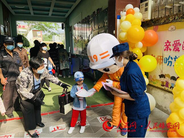 消防隊(duì)員給入園的小朋友和家長(zhǎng)發(fā)放宣傳資料。趙淑晴/攝